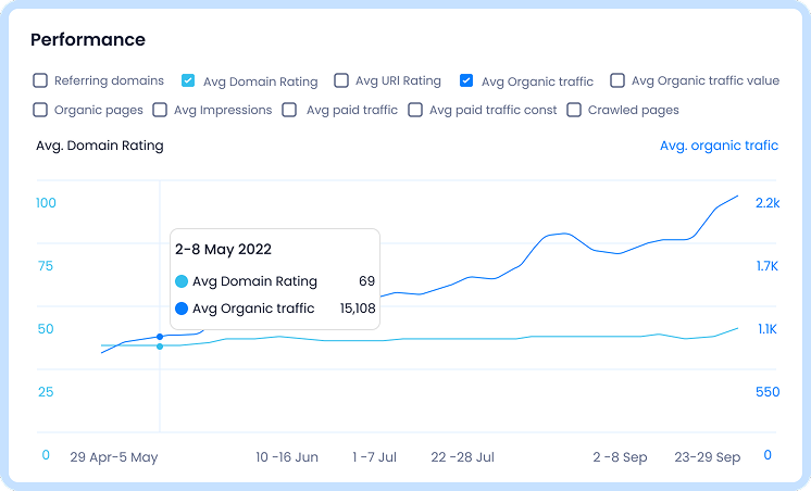 During the half year of working with the client, we already managed to increase the DR from 52 to 63, while the Traffic went from 41K to 54K.